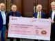 The photograph of the cheque presentation shows, from left to right: DGM RWBro Mahathir Mahzan, Dr Ernest Lim, WBro Dr Ronald Paul Ng, WM of Lodge Scientia No. 9993, and WBro Michael Gray, Chair of MCF.